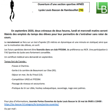 Nouvelle section sportive apnée en Lycée à la rentrée 2020