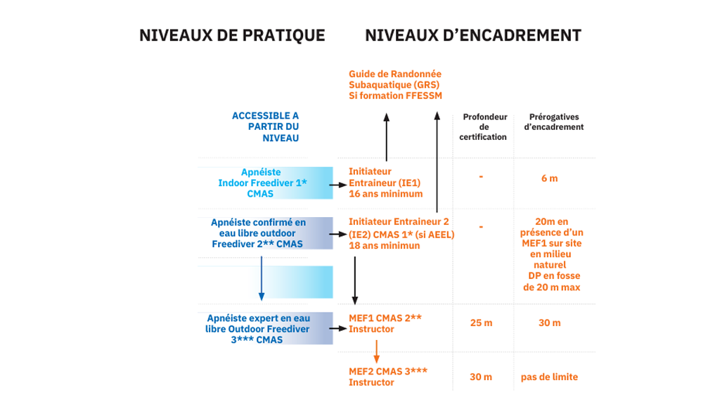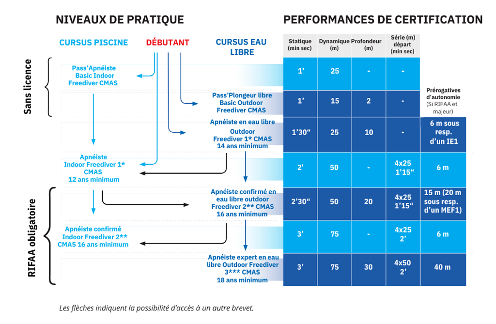 Il existe 3 niveaux d'apnéistes piscine et 4 niveaux d'apnéistes en eau libre.