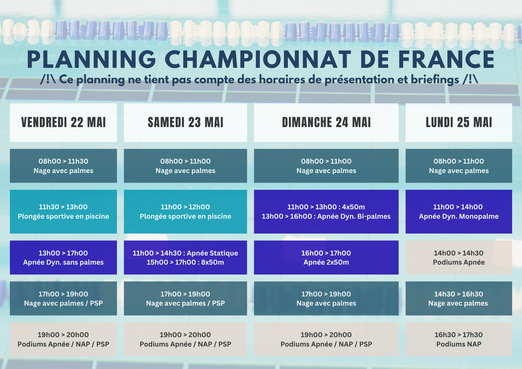 Les athlètes participants à plusieurs épreuves dans une même journée peuvent réaliser un seul émargement à l'horaire de leur première épreuve. Attention, ce planning peut encore évoluer selon les contraintes du bassin et des disciplines conjointes.